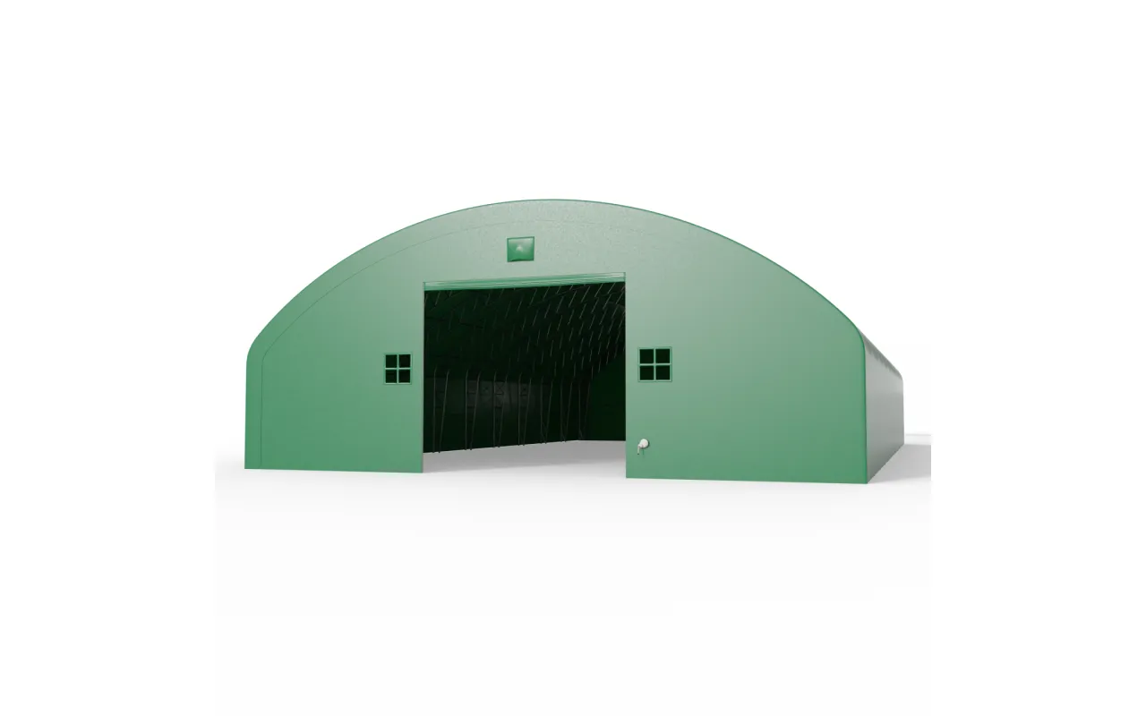 Bogenhalle mit senkrechten Seitenwänden 21,5x45,75 m PVC 750 g/m² in grüner Ausführung ist eine funktionale Arbeitshalle für Lagerung, das Abstellen von Maschinen sowie für operative Arbeitsabläufe. Die Kombination aus bogenförmiger Dachgeometrie und senkrechten Seitenwänden ermöglicht es, die volle Breite der Konstruktion zu nutzen, ohne ungenutzte Randbereiche an den Seiten. Durch die regelmäßige Form des Innenraums lassen sich Regale, Geräte und Arbeitsplätze leichter anordnen, und der Raum funktioniert wie ein klassisches Lager. Das ist eine Lösung für Landwirtschaft, Logistik und Industrie – überall dort, wo die Halle den Arbeitsalltag tatsächlich unterstützen soll.