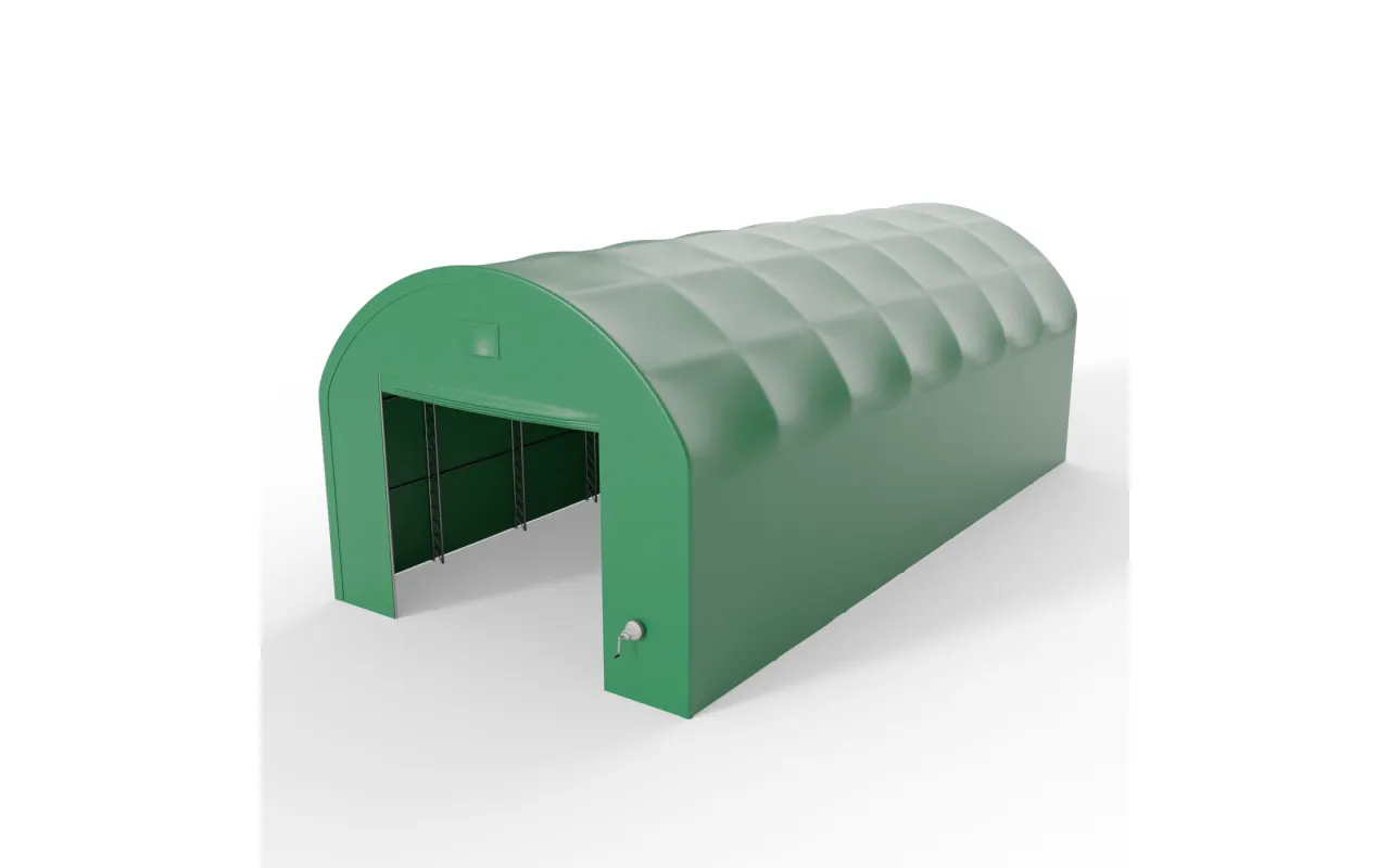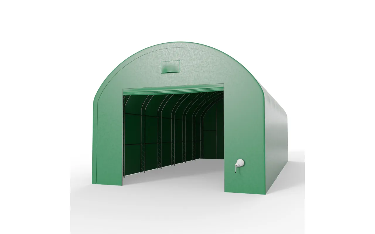 Bogenhalle mit senkrechten Seitenwänden 6,1x9,15 m PVC 900 g/m² in grüner Ausführung ist eine funktionale Arbeitshalle für Lagerung, das Abstellen von Maschinen sowie für operative Arbeitsabläufe. Die Kombination aus bogenförmiger Dachgeometrie und senkrechten Seitenwänden ermöglicht es, die volle Breite der Konstruktion zu nutzen, ohne ungenutzte Randbereiche an den Seiten. Durch die regelmäßige Form des Innenraums lassen sich Regale, Geräte und Arbeitsplätze leichter anordnen, und der Raum funktioniert wie ein klassisches Lager. Das ist eine Lösung für Landwirtschaft, Logistik und Industrie – überall dort, wo die Halle den Arbeitsalltag tatsächlich unterstützen soll.