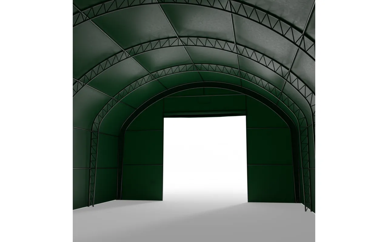 Bogenhalle mit senkrechten Seitenwänden 9,15x18,3 m PVC 900 g/m² in grüner Ausführung ist eine funktionale Arbeitshalle für Lagerung, das Abstellen von Maschinen sowie für operative Arbeitsabläufe. Die Kombination aus bogenförmiger Dachgeometrie und senkrechten Seitenwänden ermöglicht es, die volle Breite der Konstruktion zu nutzen, ohne ungenutzte Randbereiche an den Seiten. Durch die regelmäßige Form des Innenraums lassen sich Regale, Geräte und Arbeitsplätze leichter anordnen, und der Raum funktioniert wie ein klassisches Lager. Das ist eine Lösung für Landwirtschaft, Logistik und Industrie – überall dort, wo die Halle den Arbeitsalltag tatsächlich unterstützen soll.