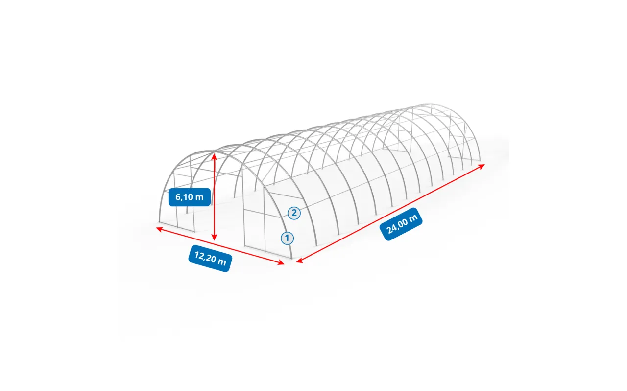 Die Konstruktion des Zeltes Bogenhalle 12,2x24 m PVC 750 g/m² in grüner Ausführung zeichnet sich durch den Einsatz von Trägerrohren und Verbindern mit vergrößertem Durchmesser aus, was die Gesamtstabilität des Systems deutlich erhöht. Das Herzstück unserer Konstruktion ist Stahl – deshalb verwenden wir kaltgewalzten Baustahl. Zusätzlich werden die Rahmenelemente perforiert und kommen ohne Schweißnähte aus. Diese Technologie bietet maximale Widerstandsfähigkeit gegenüber statischen und dynamischen Belastungen und schützt die Konstruktion zuverlässig vor Verformungen. Um den Rahmen der Bogenhallen zu schützen, werden alle Stahlelemente galvanisch verzinkt. Dieses Verfahren gewährleistet umfassenden Korrosionsschutz – sowohl im Innen- als auch im Außenbereich. So sind die Stahlrohre langfristig vor Rost geschützt. Das Dach- und Seitenspannsystem besteht aus robusten Stahlseilen, was die Stabilität der Konstruktion sichert und ein Verformen während der gesamten Nutzungsdauer verhindert. Gleichzeitig wird die Plane vor Schnee- und Winddruck geschützt. Das integrierte Spannsystem ist ein zentraler Bestandteil von Bogenhalle 12,2x24 m PVC 750 g/m² in grüner Ausführung, da es das Material straff hält und somit Faltenbildung sowie Wasseransammlungen auf der Planenoberfläche verhindert. Dadurch ist die Halle optimal gegen widrige Witterungsbedingungen wie starke Windböen oder Regen geschützt. Darüber hinaus trägt das Spannsystem zur ansprechenden Optik der Halle bei und verleiht ihr ein professionelles Erscheinungsbild.