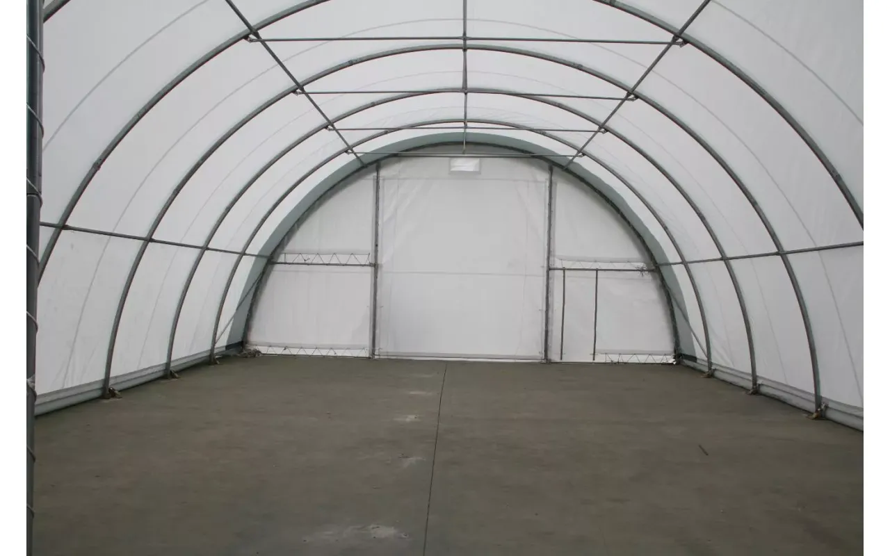 Die Ausführung 9,15×12 m mit weißer Plane aus PVC 900 g/m² ist die verstärkte Bogenhalle für intensiven Einsatz bei wechselnden Wetterbedingungen. Hohe Abriebfestigkeit und Beständigkeit gegen UV-Strahlung machen sie zur ganzjährigen Lager- oder Techniküberdachung. Seilzug-Tor und eine geschlossene Rückwand sorgen für einen sicheren Abschluss. Sie möchten wissen, wie schnell wir liefern können? Kontaktieren Sie uns – Sie erhalten eine verbindliche Antwort.