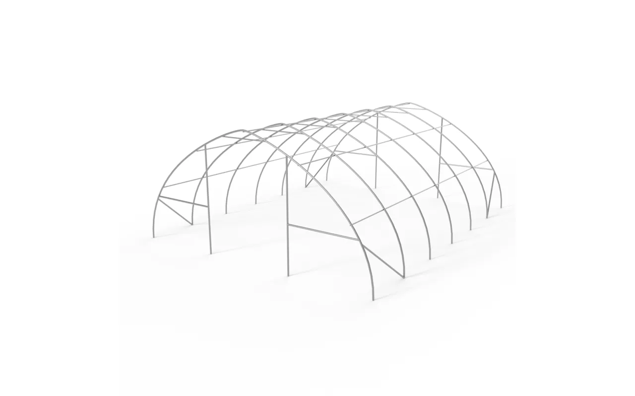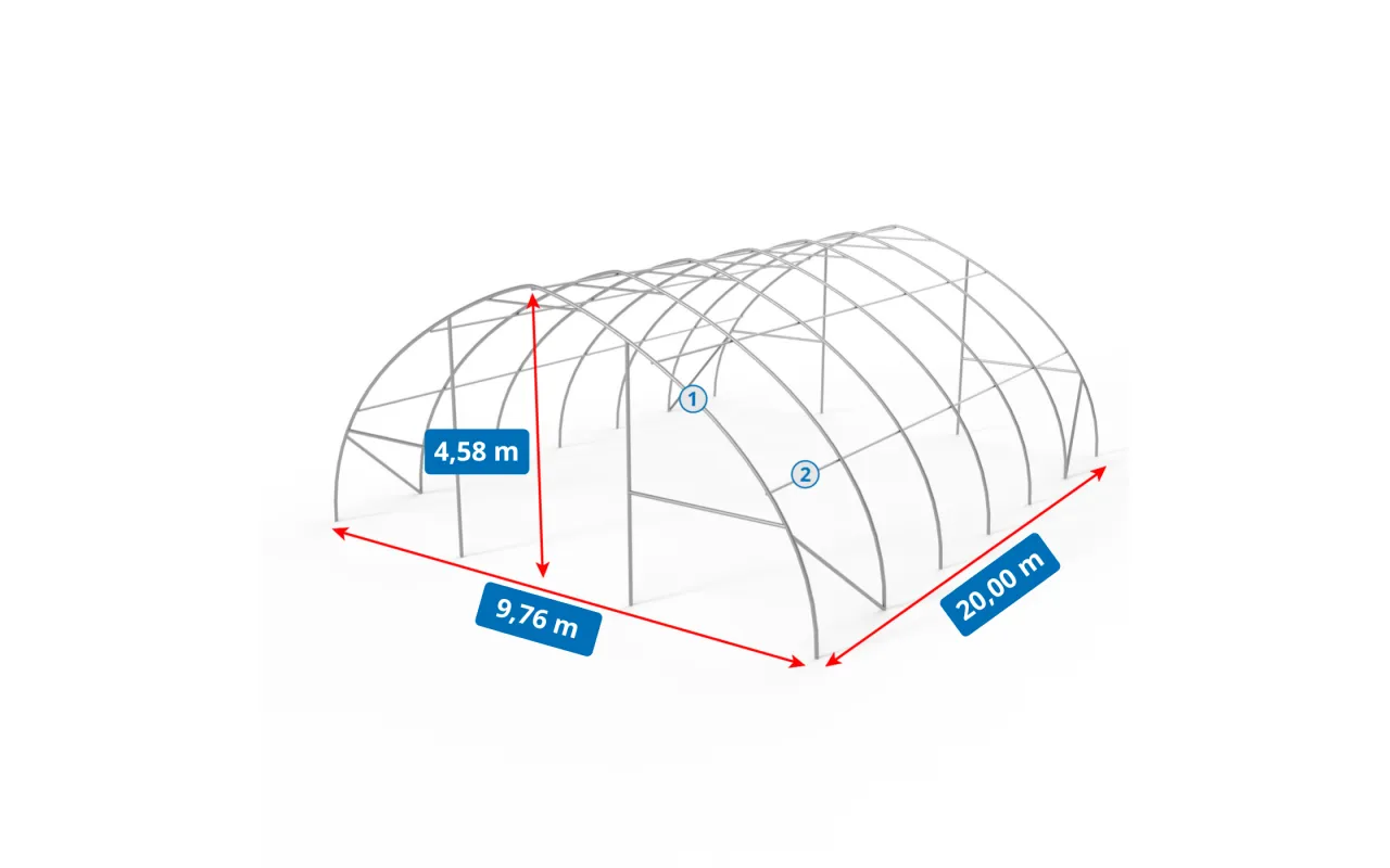 Die Konstruktion des Zeltes Bogenhalle 9,76x20 m PVC 900 g/m² zeichnet sich durch den Einsatz von Trägerrohren und Verbindern mit vergrößertem Durchmesser aus, was die Gesamtstabilität des Systems deutlich erhöht. Das Herzstück unserer Konstruktion ist Stahl – deshalb verwenden wir kaltgewalzten Baustahl. Zusätzlich werden die Rahmenelemente perforiert und kommen ohne Schweißnähte aus. Diese Technologie bietet maximale Widerstandsfähigkeit gegenüber statischen und dynamischen Belastungen und schützt die Konstruktion zuverlässig vor Verformungen. Um den Rahmen der Bogenhallen zu schützen, werden alle Stahlelemente galvanisch verzinkt. Dieses Verfahren gewährleistet umfassenden Korrosionsschutz – sowohl im Innen- als auch im Außenbereich. So sind die Stahlrohre langfristig vor Rost geschützt. Das Dach- und Seitenspannsystem besteht aus robusten Stahlseilen, was die Stabilität der Konstruktion sichert und ein Verformen während der gesamten Nutzungsdauer verhindert. Gleichzeitig wird die Plane vor Schnee- und Winddruck geschützt. Das integrierte Spannsystem ist ein zentraler Bestandteil von Bogenhalle 9,76x20 m PVC 900 g/m², da es das Material straff hält und somit Faltenbildung sowie Wasseransammlungen auf der Planenoberfläche verhindert. Dadurch ist die Halle optimal gegen widrige Witterungsbedingungen wie starke Windböen oder Regen geschützt. Darüber hinaus trägt das Spannsystem zur ansprechenden Optik der Halle bei und verleiht ihr ein professionelles Erscheinungsbild.