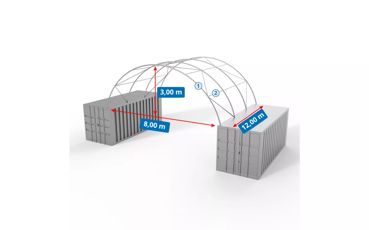 Container Überdachung 8x12 m ist eine modulare Zeltüberdachung zum Schutz der Fläche zwischen Containern. Geeignet für Logistikunternehmen, Lager und Baustellen – zuverlässiger Wetterschutz vor Regen, Schnee und intensiver Sonne. Aus strapazierfähigem PVC-Material für langlebigen Einsatz und hohe Sicherheit. Schnell auf vorhandenen Containern montierbar und individuell anpassbar: auf Wunsch rundum geschlossen, mit Einfahrtstor oder Eingangstür. Fragen Sie jetzt die passende Ausführung für Ihren Standort an.
