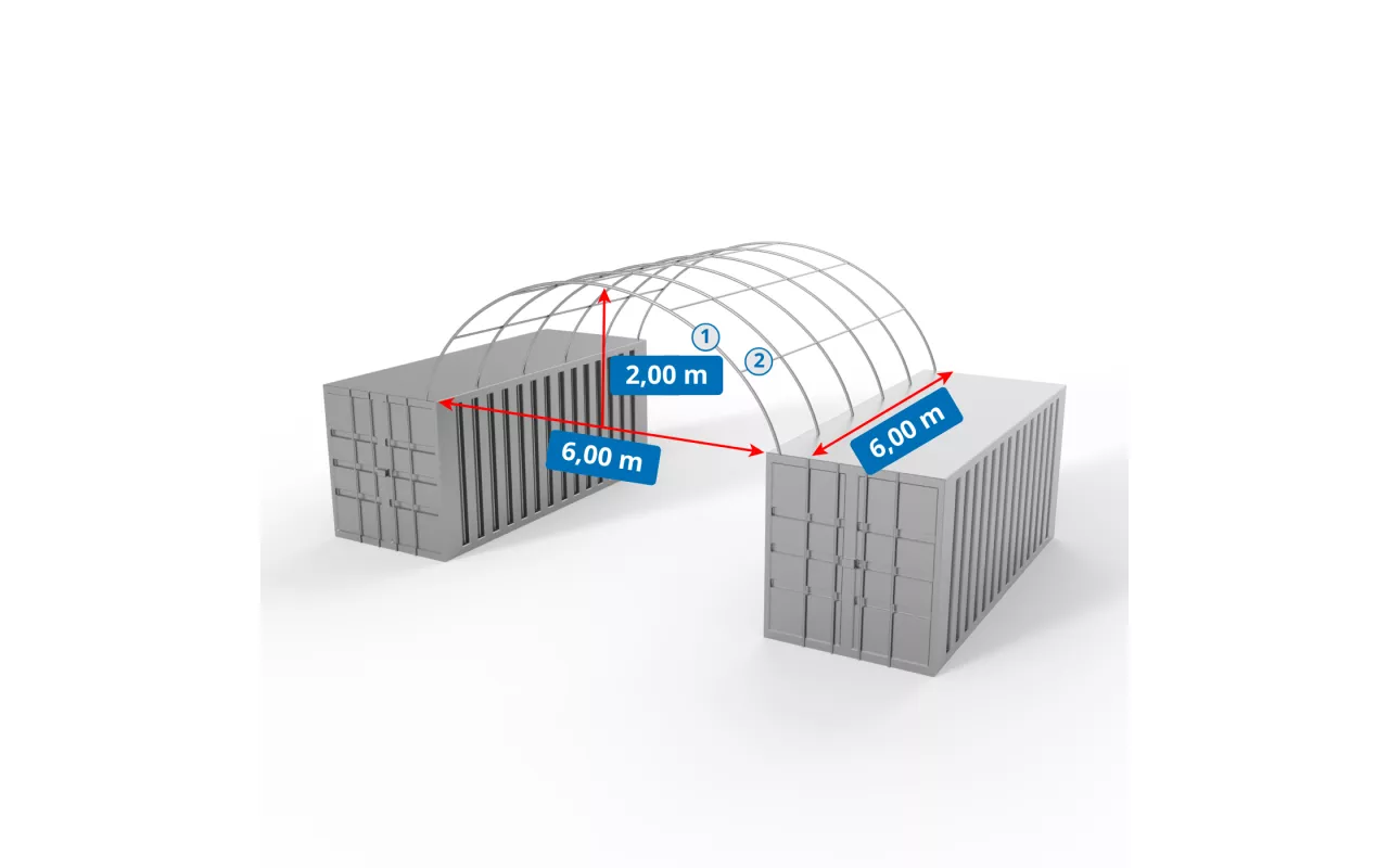 Container Überdachung 6x6 m steht für eine flexible, praxisnahe Überdachung zum Schutz der Fläche zwischen Containern. Ideal für Logistikunternehmen, Lagerstandorte und Baustellen: zuverlässiger Schutz vor Regen, Schnee und starker Sonneneinstrahlung. Die Konstruktion aus strapazierfähigem PVC-Material mit 900 g/m² ist auf dauerhaften Einsatz ausgelegt und erhöht die Betriebssicherheit. Container-Überdachungen aus PVC werden kundenspezifisch angepasst – auf Wunsch als rundum geschlossener Raum mit Einfahrtstor oder Eingangstür. Dank einfacher Montage sind Standortwechsel schnell umsetzbar. Fordern Sie Ihre Konfiguration an.