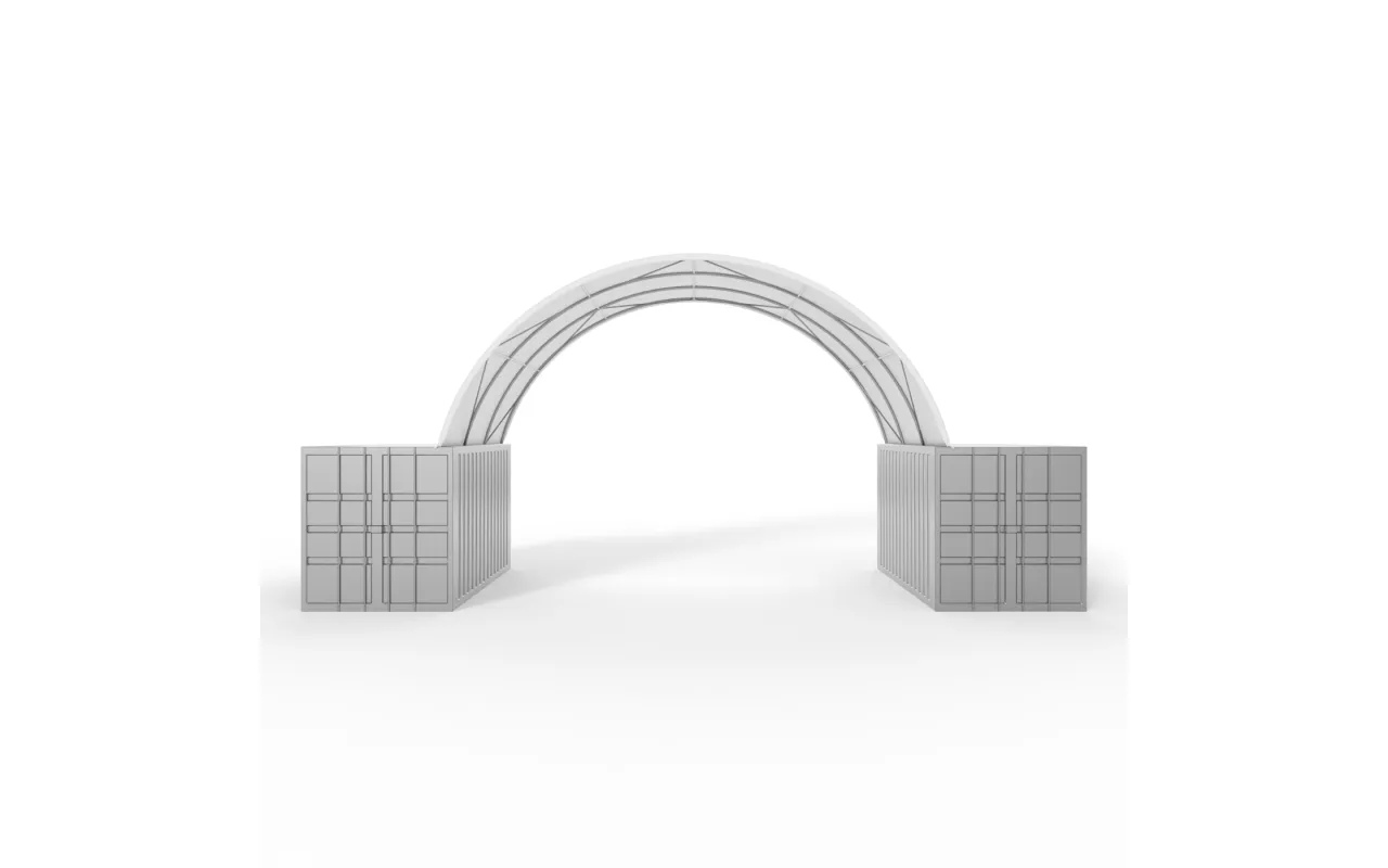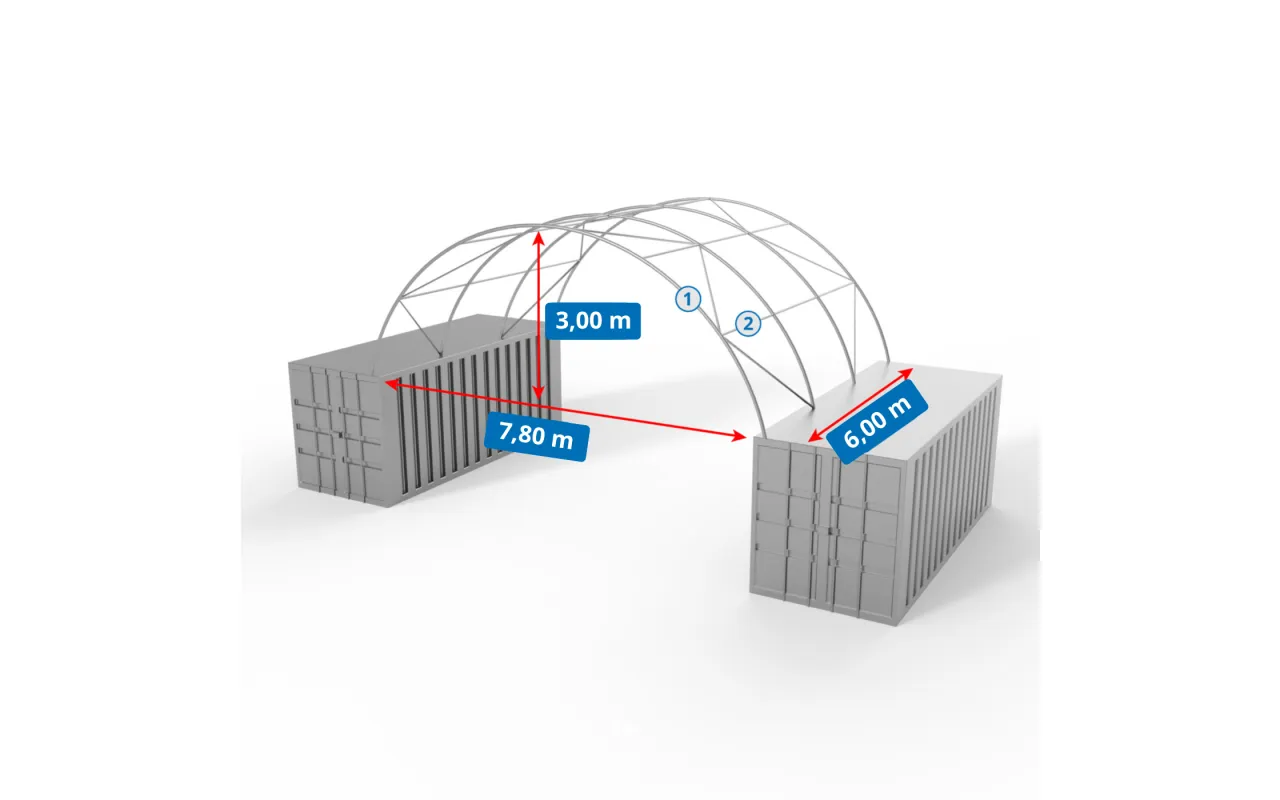 Container Überdachung 8x6 m ist eine flexible, robuste Lösung zur Überdachung der Fläche zwischen Containern. Geeignet für Logistikunternehmen, Lagerstandorte und Baustellen – mit zuverlässigem Schutz vor Regen, Schnee und intensiver UV-Belastung. Die Konstruktion aus strapazierfähigem PVC-Material mit 900 g/m² ist für dauerhaften Einsatz konzipiert und unterstützt sichere Abläufe im Außenbereich. Überdachungen aus PVC werden kundenspezifisch ausgeführt; auf Wunsch als geschlossene Einheit mit Einfahrtstor oder Eingangstür. Schnelle Montage ermöglicht auch kurzfristige Standortwechsel. Fragen Sie Ihre Ausführung an.