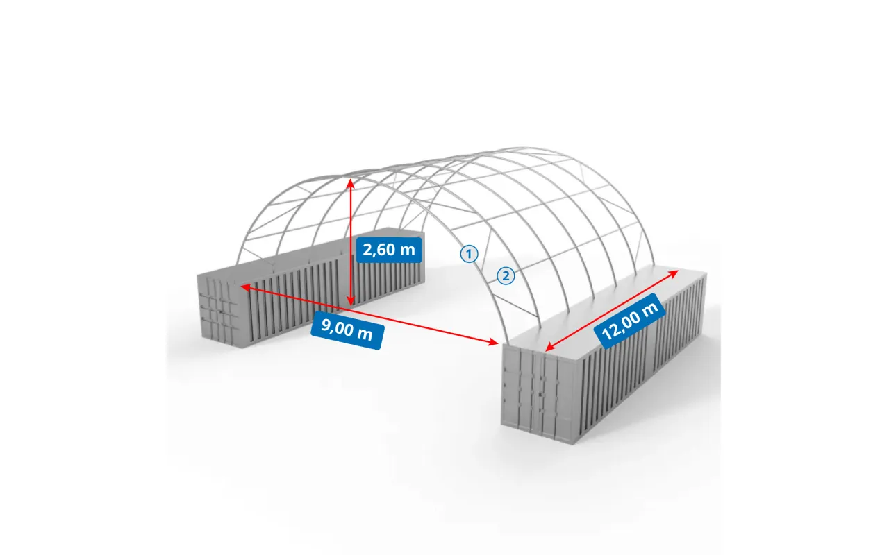 Container Überdachung 9,15x12 m ist eine flexible Zeltüberdachung zum Sichern und Schützen der Fläche zwischen Containern. Sie eignet sich für Logistikunternehmen, Lager und Baustellen und schützt zuverlässig vor Regen, Schnee und intensiver Sonneneinstrahlung. Die Ausführung aus strapazierfähigem PVC-Material ist für den dauerhaften Einsatz konzipiert; bei diesem Modell beträgt die Planenstärke 750 g/m². Containerüberdachungen PVC können kundenspezifisch ausgeführt werden – z. B. als rundum geschlossener Bereich mit Einfahrtstor oder Eingangstür. Schneller Aufbau und leichte Umsetzbarkeit ermöglichen eine zügige Standortänderung bei wechselndem Bedarf.
