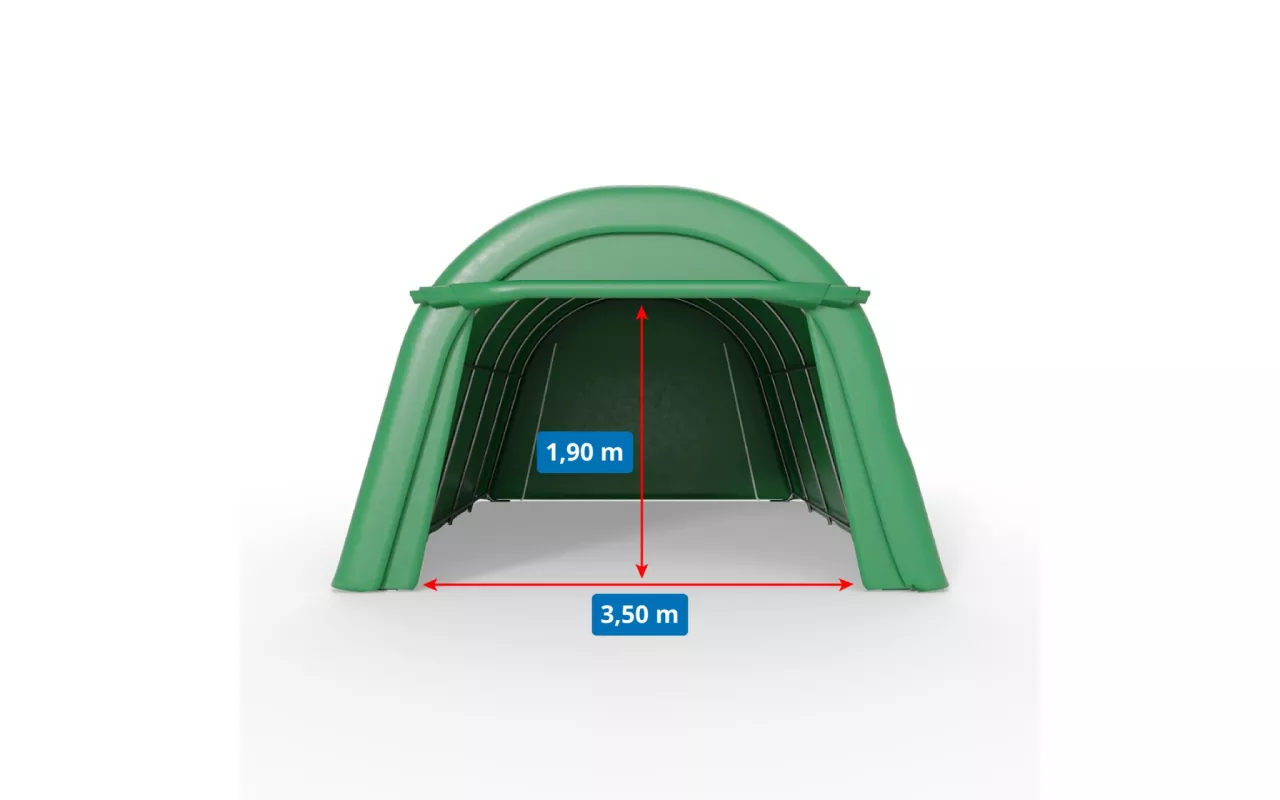Rundbogen-Garage Zelt in grüner Ausführung 3,66x6,1 m ist eine robuste, vielseitige Unterstelllösung. Als Garage Zelt schützt es Fahrzeuge, Landtechnik und Bauausrüstung zuverlässig. Die Bogenkonstruktion in Kombination mit der Plane aus PVC mit einer Grammatur von 900 g/m² bietet hohe Reißfestigkeit und Witterungsreserven – auch gegen Wind, Schnee, Regen und UV-Strahlen. Schneller Aufbau, leicht versetzbar, ideal für Privat und Gewerbe. Jetzt Angebot anfordern.