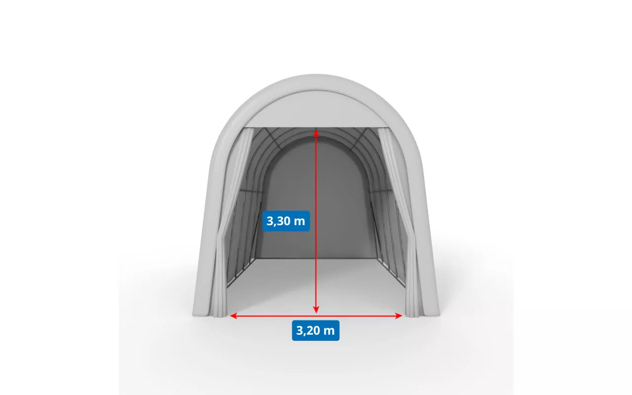 Rundbogen-Garage Zelt 4,3x9,2 m ist eine widerstandsfähige, universelle Unterstellfläche. Als Garage Zelt schützt es Fahrzeuge, Landmaschinen und Baugeräte zuverlässig. Die robuste Bogenkonstruktion und die Plane aus PVC mit einer Grammatur von 900 g/m² bieten erhöhte Stabilität und lange Lebensdauer – inklusive Schutz vor Regen, Schnee, Wind und UV-Strahlen. Schnell montierbar und bei Bedarf versetzbar. Fordern Sie Ihr Angebot mit Zubehör an.