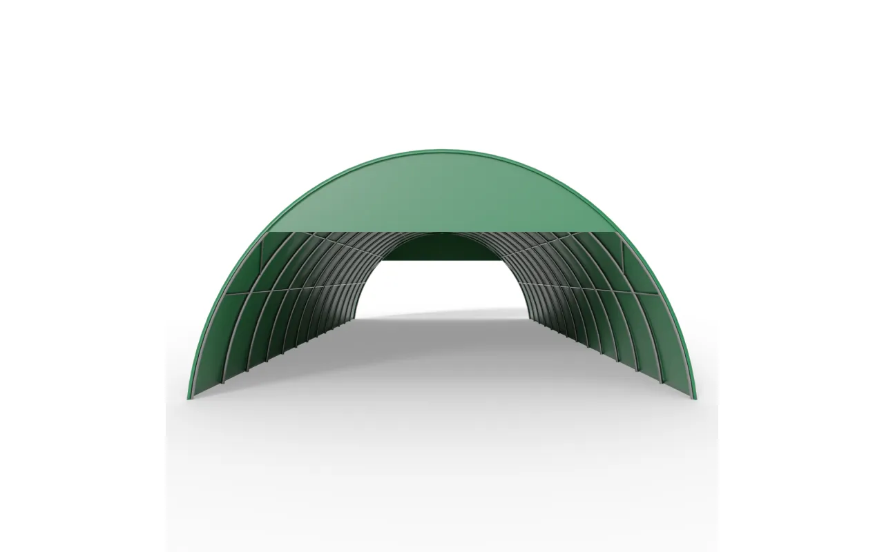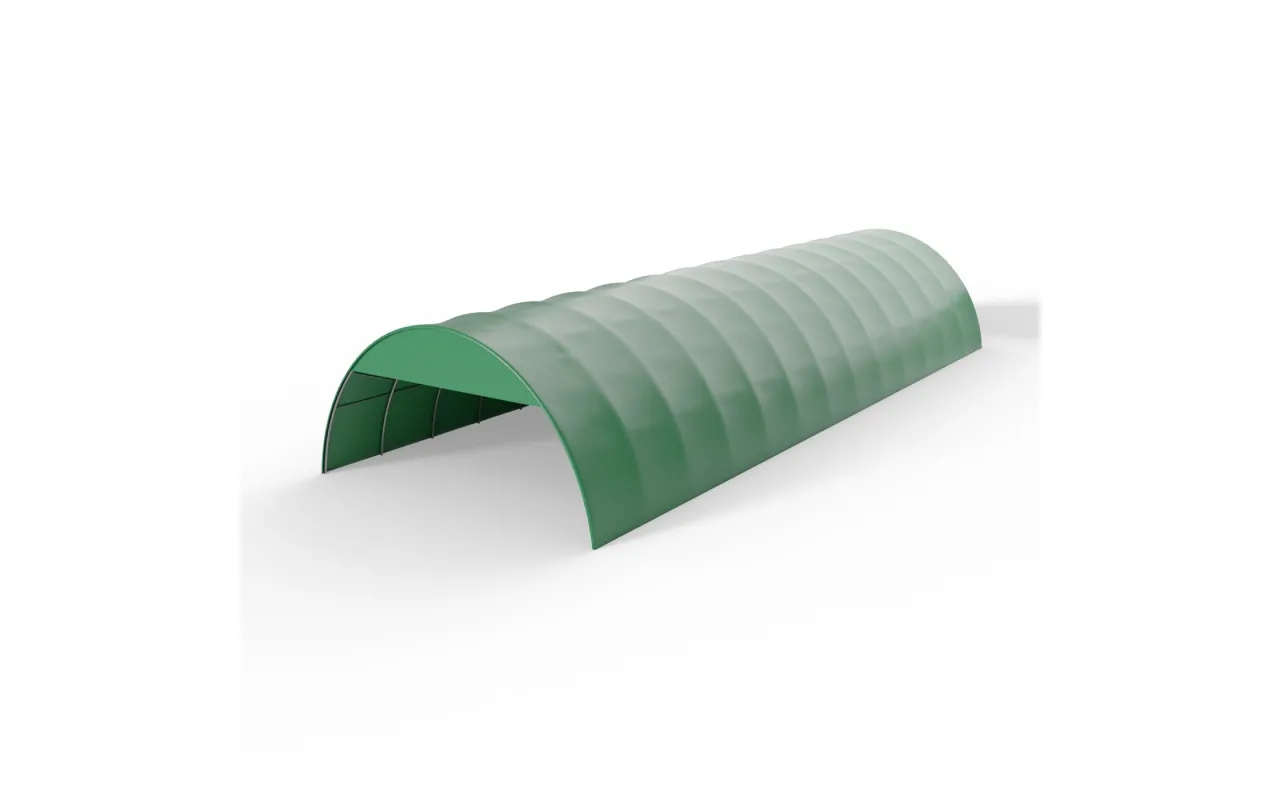 Je nach Hallenbreite und gewünschter Stabilität ist Giebelverkleidung für Bogenhalle 12 m in grüner Ausführung PVC 900 g/m² in zwei Konstruktionsvarianten erhältlich. Abdeckungen ohne Gestell werden direkt am Bogen der Halle befestigt und decken einen Abschnitt von 1,5 m ab (für 12-m-Hallen). Diese leichte und schnell montierbare Lösung eignet sich für Standardanwendungen. Abdeckungen mit Gestell sind für breitere Konstruktionen (15 m) vorgesehen. Sie bieten eine größere Abdeckung von bis zu 3 m und verfügen über einen Stahlrahmen, der für höhere Windbeständigkeit und passgenaue Anpassung an die Hallengeometrie sorgt. Beide Varianten von Giebelverkleidung für Bogenhalle 12 m in grüner Ausführung PVC 900 g/m² sind vollständig kompatibel mit den Rundbogenhallen von Gazelt und auf die jeweilige Hallenbreite zugeschnitten.