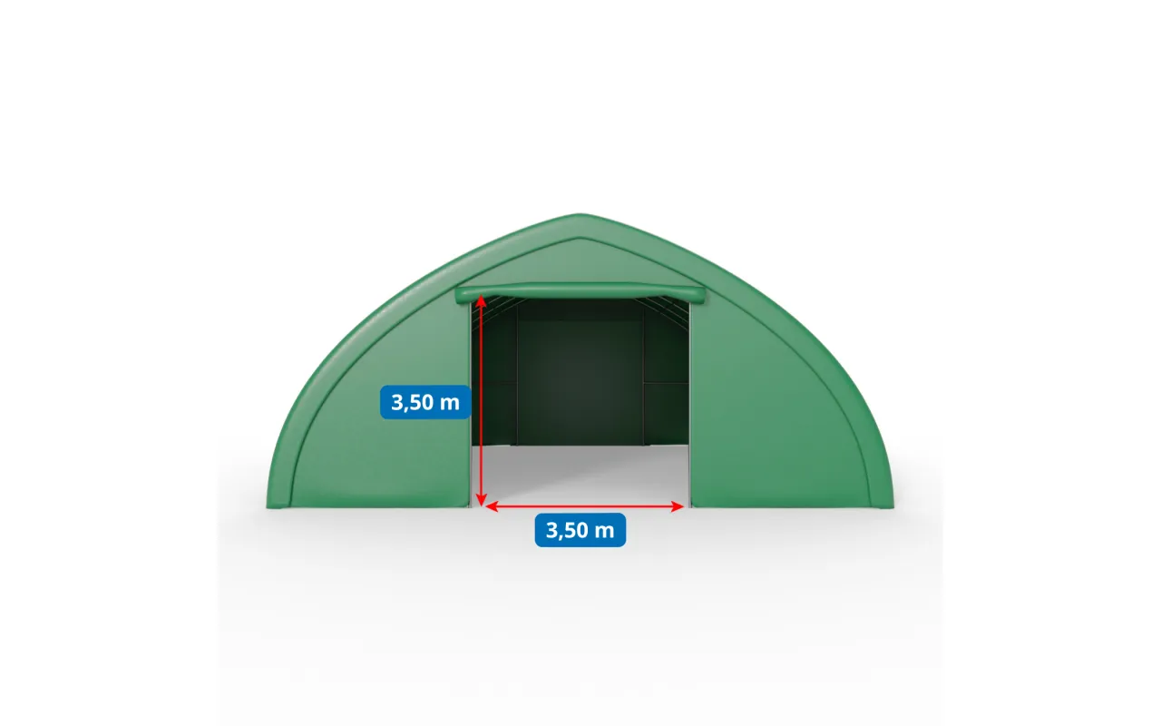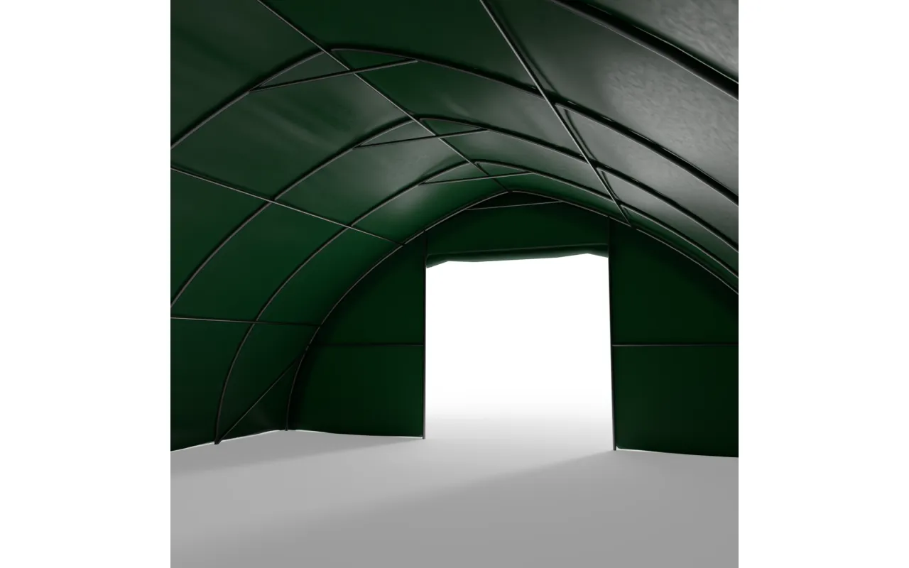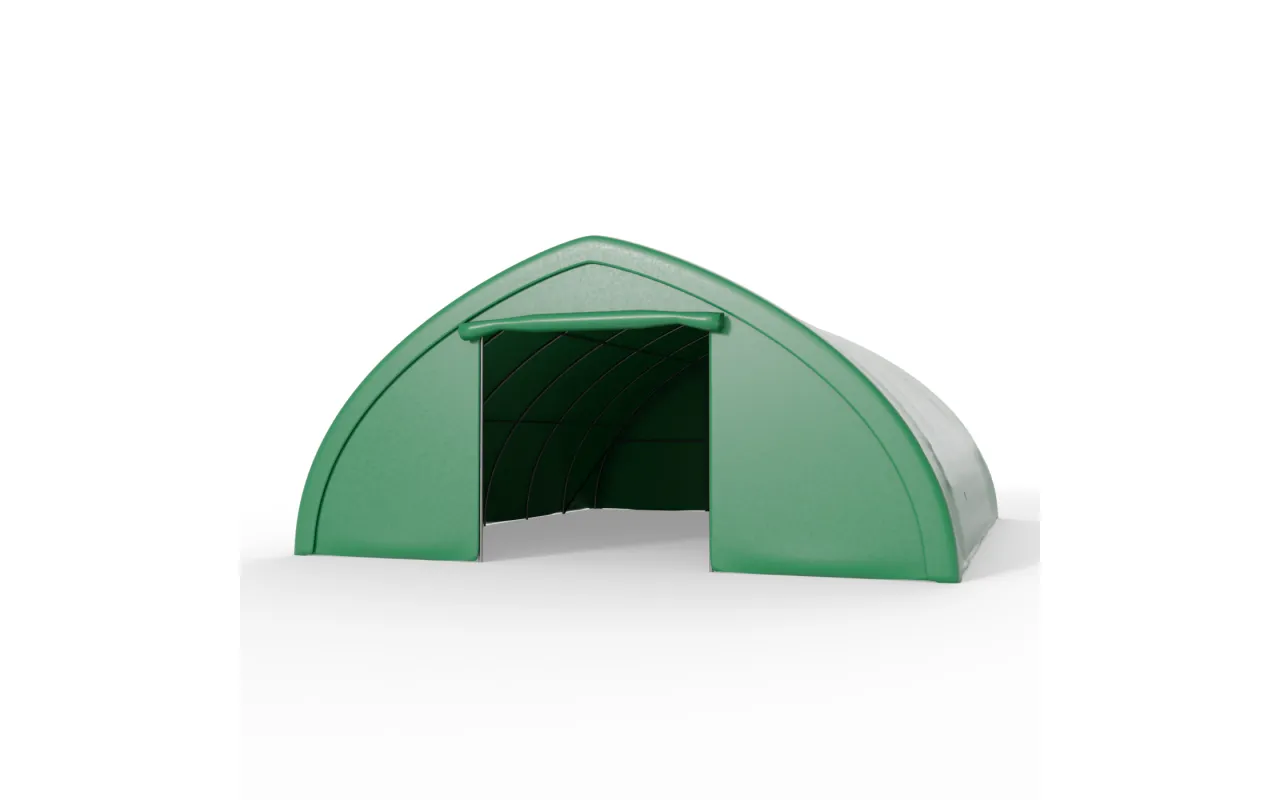 Dieses Modell eignet sich gut überall dort, wo der Betrieb ein größeres, geordnetes Hinterland zur Lagerung von Geräten, Materialien und Ausstattung benötigt, die regelmäßig in der täglichen Arbeit eingesetzt werden. Eine solche Halle kann die Rolle eines dauerhaften Arbeits- und Lagerbereichs übernehmen, der das Gelände strukturiert und den Zugriff auf Dinge erleichtert, die bei intensiver Nutzung über einen großen Teil des Jahres benötigt werden. Für Stabilität sorgt die Konstruktion auf einem Stahlrahmen, und die bogenförmige Dachform erleichtert den Wasser- und Schneeablauf von der Plane. Die grüne Plane aus PVC 900 g/m² schützt das Halleninnere vor Witterungseinflüssen und fügt sich gut in das Umfeld von Wirtschaftsgebäuden und Grünflächen ein.