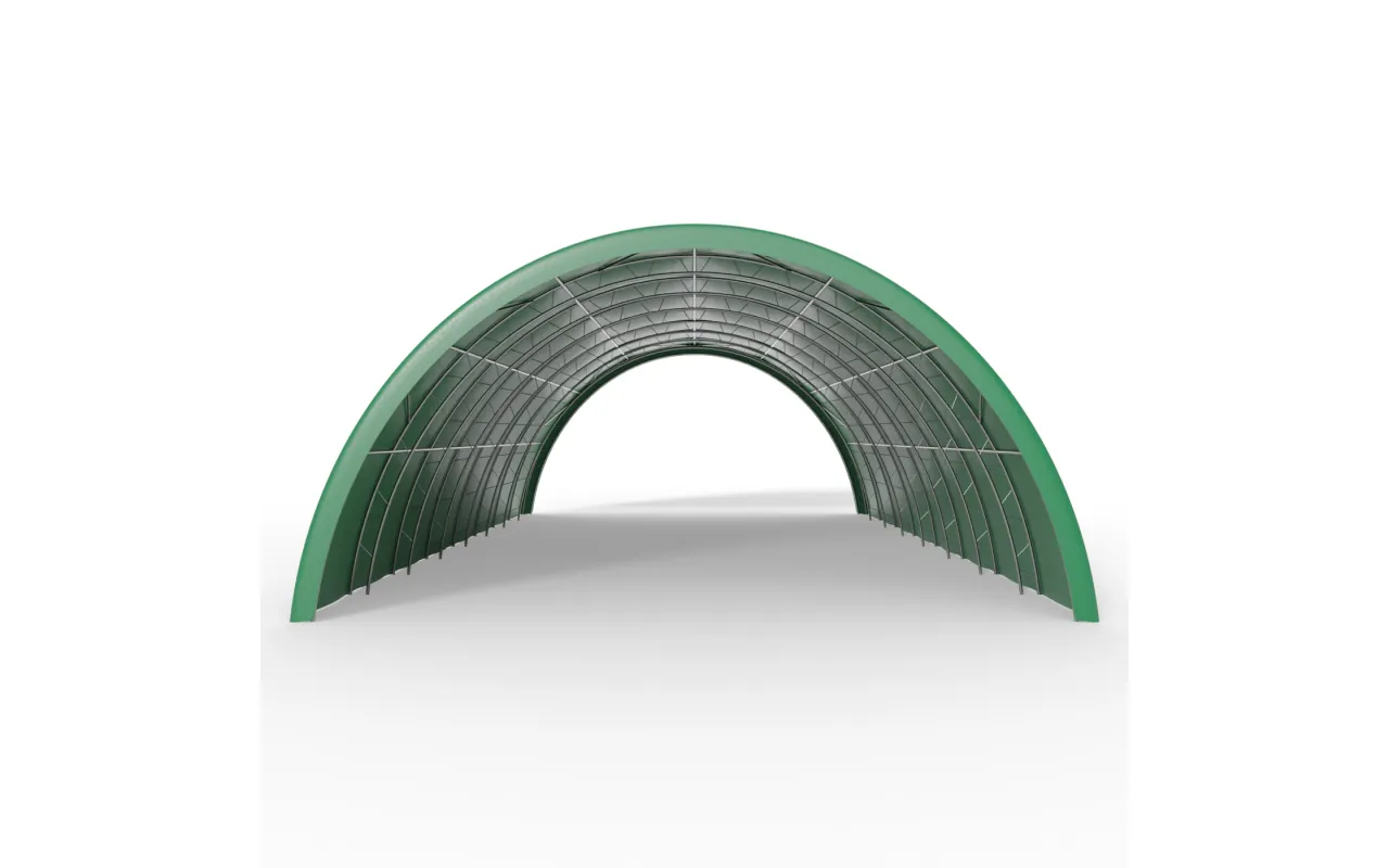 Verstärkte Rundbogenhalle 12,2x18 m PVC 900 g/m² in grüner Ausführung wurde speziell für landwirtschaftliche Betriebe, Viehzucht sowie kleine und mittlere Unternehmen entwickelt, die zuverlässigen Lagerraum benötigen. Sie eignet sich ideal als ganzjähriger oder saisonaler Unterstand für Heu- und Strohballen, landwirtschaftliche Maschinen, Dünger oder Futtermittel. Ebenso ist sie eine hervorragende Lösung zur Lagerung von Ernten in Big-Bags, Gemüse, landwirtschaftlichen Erzeugnissen und Geräten, die vor Regen, Schnee oder Sonne geschützt werden müssen. Die bogenförmige Tunnelkonstruktion ermöglicht eine effiziente Raumnutzung, erlaubt die Durchfahrt großer Maschinen ohne das Öffnen von Toren und sorgt für eine natürliche Luftzirkulation. Dank der offenen Giebelkonstruktion und der vielfältigen Konfigurationsmöglichkeiten kann Verstärkte Rundbogenhalle 12,2x18 m PVC 900 g/m² in grüner Ausführung viele Funktionen übernehmen und sich problemlos an die wechselnden Anforderungen des Betriebs anpassen.
