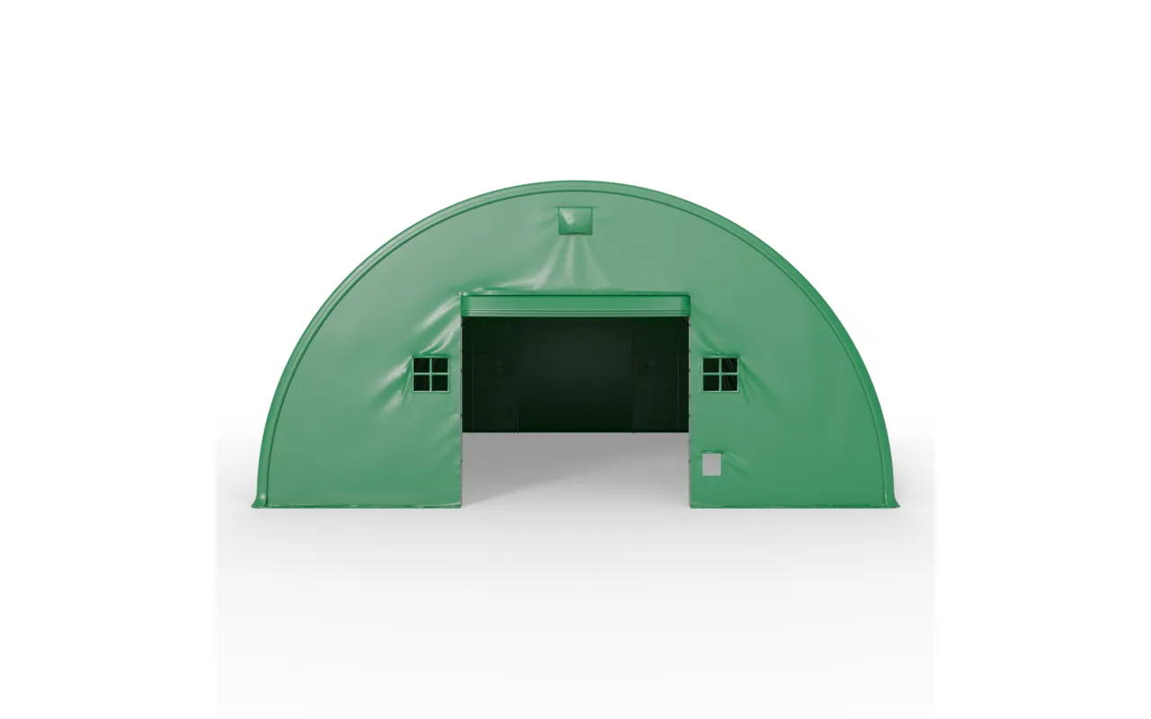 Beidseitige Wand für Tunnelhalle in grüner Ausführung 15 m PVC 750 g/m² ist ein Konstruktionselement, das eine Rundbogenhalle je nach Einsatzzweck und Bedarf des Nutzers effektiv an einer oder beiden Stirnseiten verschließt. Die Frontwände sind mit einem manuell bedienbaren Rolltor (Seil- oder Kurbelmechanismus) ausgestattet, das eine komfortable Zufahrt für Maschinen oder den Zugang zu Fuß ermöglicht. Rückwände hingegen sind als geschlossene Elemente ohne Tor ausgeführt und schützen die Rückseite der Halle zuverlässig vor Witterungseinflüssen. [nazwa produktu] schützt das Halleninnere vor Wind, Niederschlägen und Staub und steigert gleichzeitig den Nutzwert der Konstruktion, indem es die Organisation der Lagerfläche verbessert und die tägliche Logistik erleichtert.