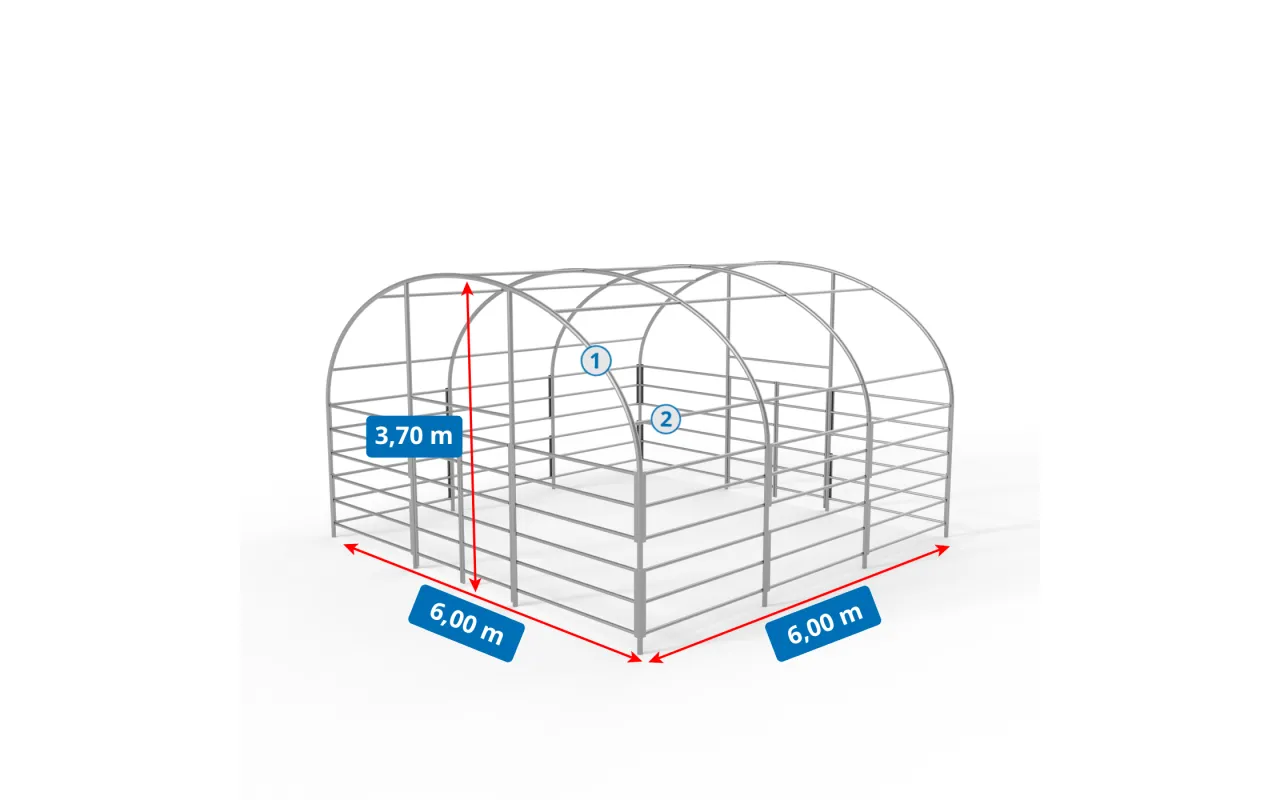 Die Konstruktion des Weidezelt 6x6 m PVC 750 g/m² zeichnet sich durch die Verwendung von Trägerrohren und Verbindern mit größerem Durchmesser aus, was zu einer erhöhten Festigkeit des gesamten Systems führt. Das Herzstück unserer Konstruktion ist Stahl, daher haben wir kaltgewalzten Baustahl verwendet. Zudem sind die Rahmenkomponenten perforiert und vermeiden Schweißnähte, da diese Technologie die höchste Widerstandsfähigkeit der Konstruktion gegen statische und dynamische Belastungen aufweist und potenzielle Verformungen verhindert. Zum Schutz des Rahmens im Tiergehege wurden die stählernen Komponenten einer galvanischen Verzinkung unterzogen. Diese Methode gewährleistet einen umfassenden Korrosionsschutz sowohl unter Innen- als auch Außenbedingungen. Dadurch zeigen die Stahlrohre eine hohe Widerstandsfähigkeit gegen Rostbildung. Das Spannsystem für Dach und Seitenwände besteht aus Stahldrähten. Dies sorgt für die Stabilität der Konstruktion, die sich nicht verformt und während der gesamten Nutzungsdauer fest bleibt. Dadurch wird auch die Plane vor Schnee- und Winddruck geschützt. Das interne Spannsystem ist bei Weidezelt 6x6 m PVC 750 g/m² von entscheidender Bedeutung, da es das Material unter Spannung hält und das Entstehen von Falten und Wasseransammlungen auf der Planenoberfläche verhindert. Dies bietet eine bessere Schutzwirkung der Halle vor ungünstigen Wetterbedingungen wie starkem Wind oder Regen. Dieses System trägt auch zur Ästhetik des Zeltes bei und verleiht ihm ein makelloses und professionelles Aussehen.