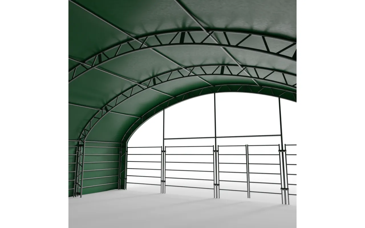 Die Konstruktion des Weidezelt 10x10 m PVC 750 g/m² zeichnet sich durch die Verwendung von Trägerrohren und Verbindern mit größerem Durchmesser aus, was zu einer erhöhten Festigkeit des gesamten Systems führt. Das Herzstück unserer Konstruktion ist Stahl, daher haben wir kaltgewalzten Baustahl verwendet. Zudem sind die Rahmenkomponenten perforiert und vermeiden Schweißnähte, da diese Technologie die höchste Widerstandsfähigkeit der Konstruktion gegen statische und dynamische Belastungen aufweist und potenzielle Verformungen verhindert. Zum Schutz des Rahmens im Tiergehege wurden die stählernen Komponenten einer galvanischen Verzinkung unterzogen. Diese Methode gewährleistet einen umfassenden Korrosionsschutz sowohl unter Innen- als auch Außenbedingungen. Dadurch zeigen die Stahlrohre eine hohe Widerstandsfähigkeit gegen Rostbildung. Das Spannsystem für Dach und Seitenwände besteht aus Stahldrähten. Dies sorgt für die Stabilität der Konstruktion, die sich nicht verformt und während der gesamten Nutzungsdauer fest bleibt. Dadurch wird auch die Plane vor Schnee- und Winddruck geschützt. Das interne Spannsystem ist bei Weidezelt 10x10 m PVC 750 g/m² von entscheidender Bedeutung, da es das Material unter Spannung hält und das Entstehen von Falten und Wasseransammlungen auf der Planenoberfläche verhindert. Dies bietet eine bessere Schutzwirkung der Halle vor ungünstigen Wetterbedingungen wie starkem Wind oder Regen. Dieses System trägt auch zur Ästhetik des Zeltes bei und verleiht ihm ein makelloses und professionelles Aussehen.