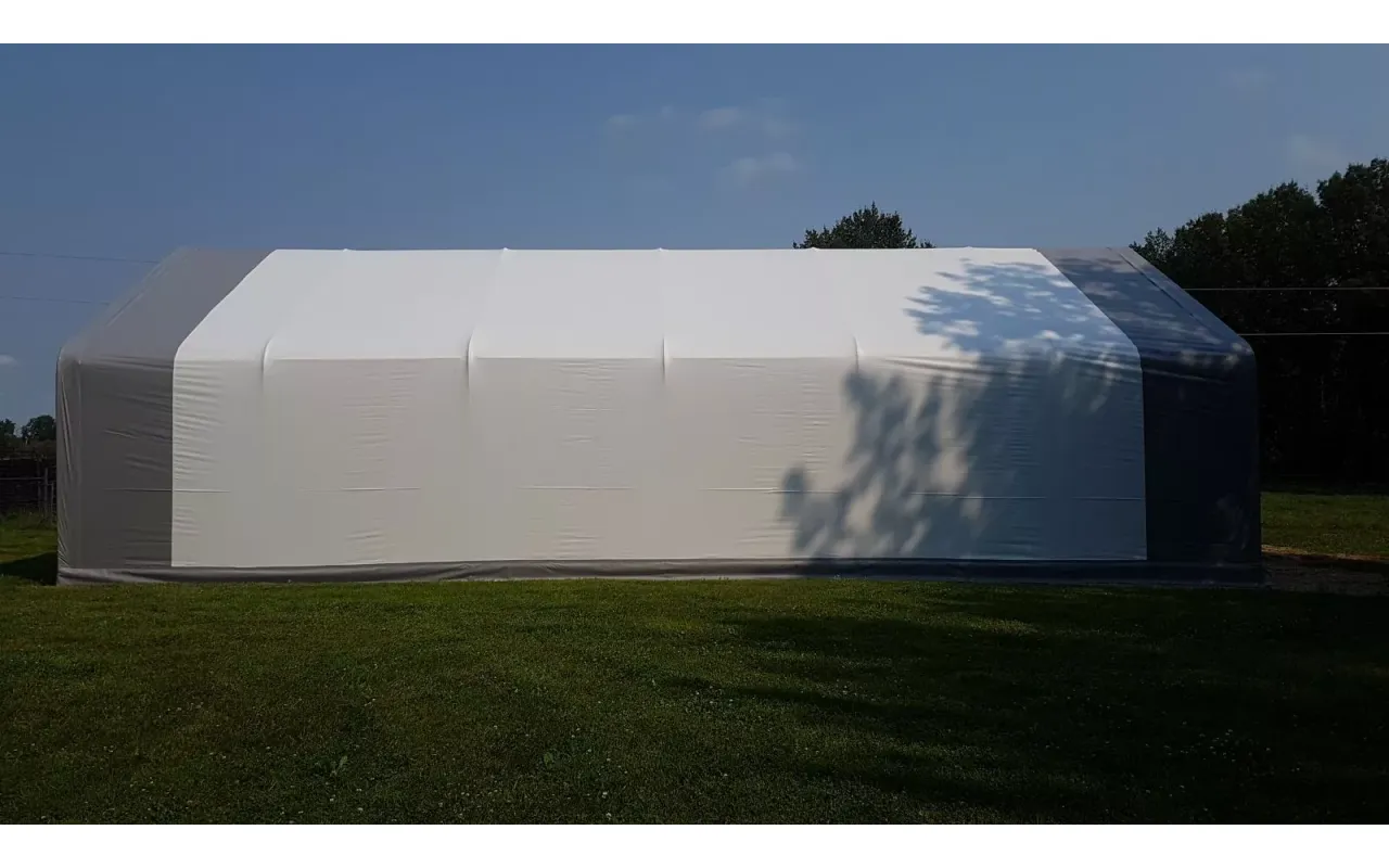 Die Wandkonstruktion des Zelts mit Satteldach mit senkrechten, hohen Seitenwänden ermöglicht eine effiziente Nutzung der Lagerfläche bis direkt an die Seiten. Zelthalle mit Satteldach 9,15x12,2 m ist eine flexible Lösung für Industriebranche, Landwirtschaft und Logistik. Die steile Dachkonstruktion unterstützt den sicheren Schneeabrutsch und Regenabfluss und reduziert das Risiko einer Überlastung durch extreme Witterungsbedingungen. Schnell montierbar und bei Bedarf zügig anpassbar. Auch als Lagerzelt ideal für planbare, wettergeschützte Betriebsflächen.