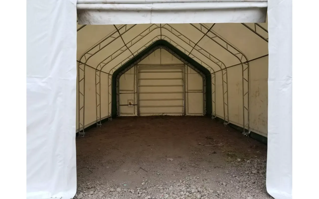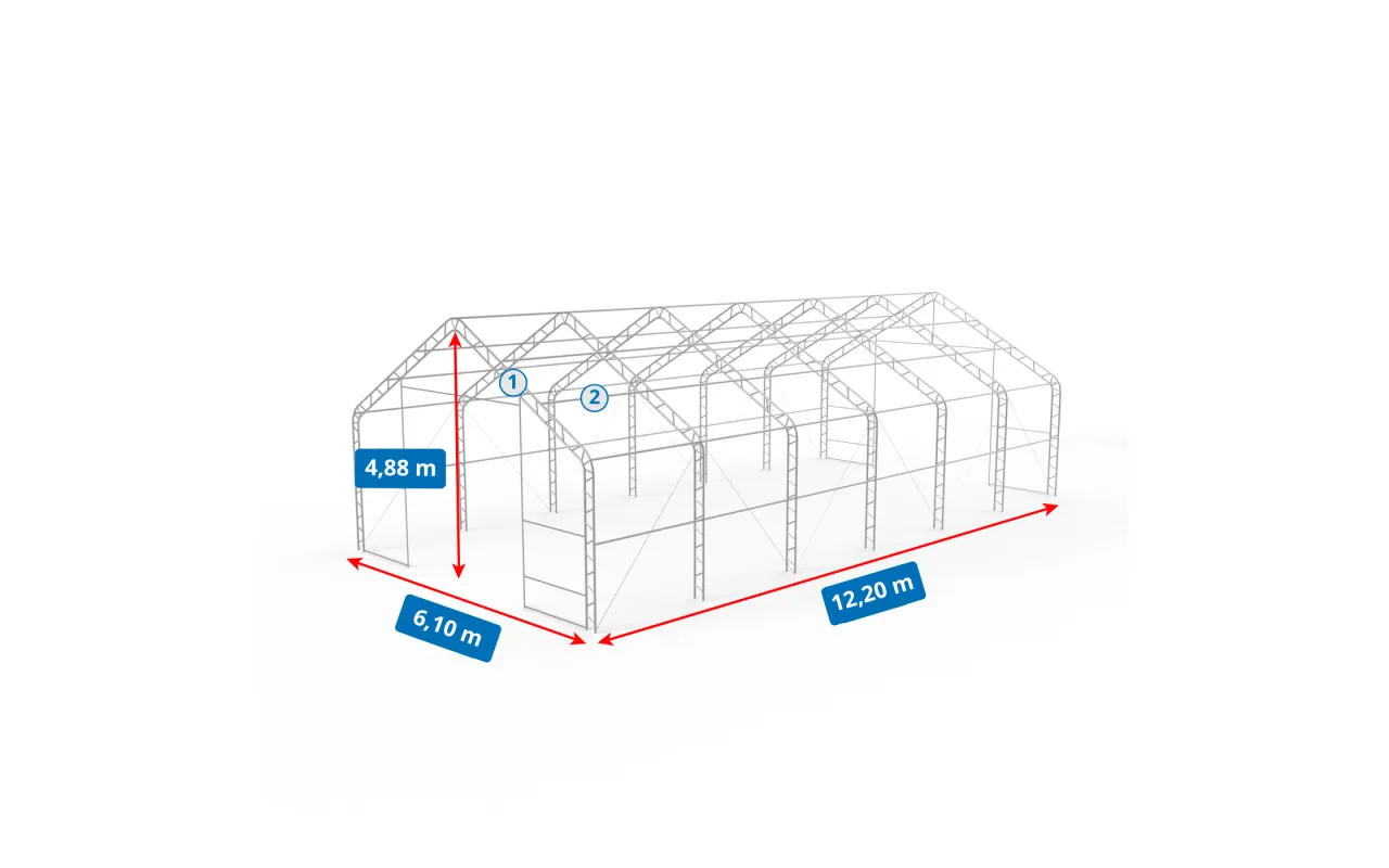 Die Konstruktion mit Satteldach und mit senkrechten, hohen Seitenwänden sorgt für eine effiziente Raumausnutzung entlang der Seiten. Die Zelthalle mit Satteldach 6,1x12,2 m mit PVC mit einer Grammatur von 900 g bietet hohe Widerstandsfähigkeit gegen anspruchsvolle Witterung und ist auf dauerhaften Betrieb ausgelegt. Die steile Dachkonstruktion leitet Schnee und Regen zuverlässig ab und schützt vor Überlastung. Dank schneller Montage eignet sie sich für flexible Lageranforderungen. Kontaktieren Sie uns für die passende Konfiguration.