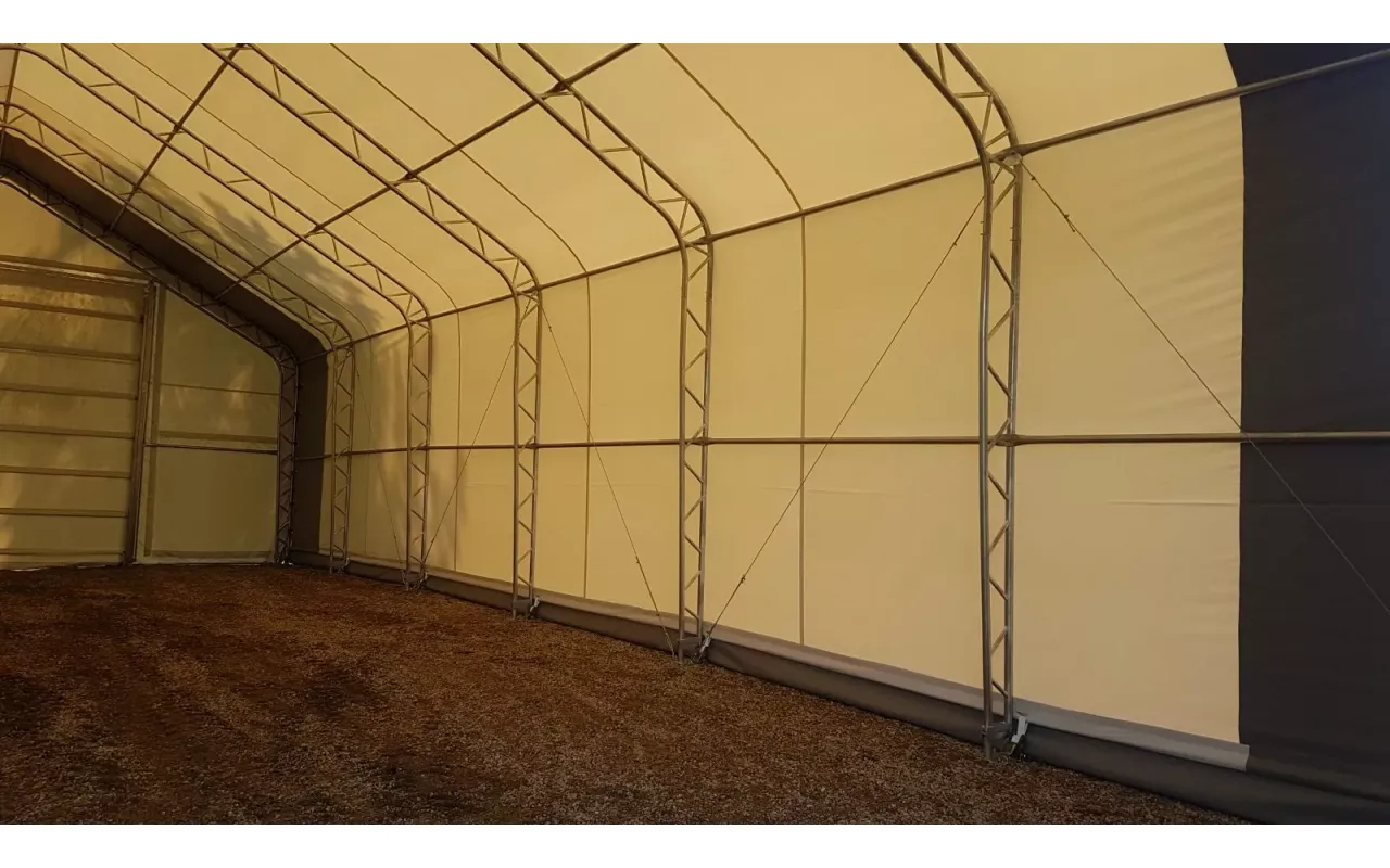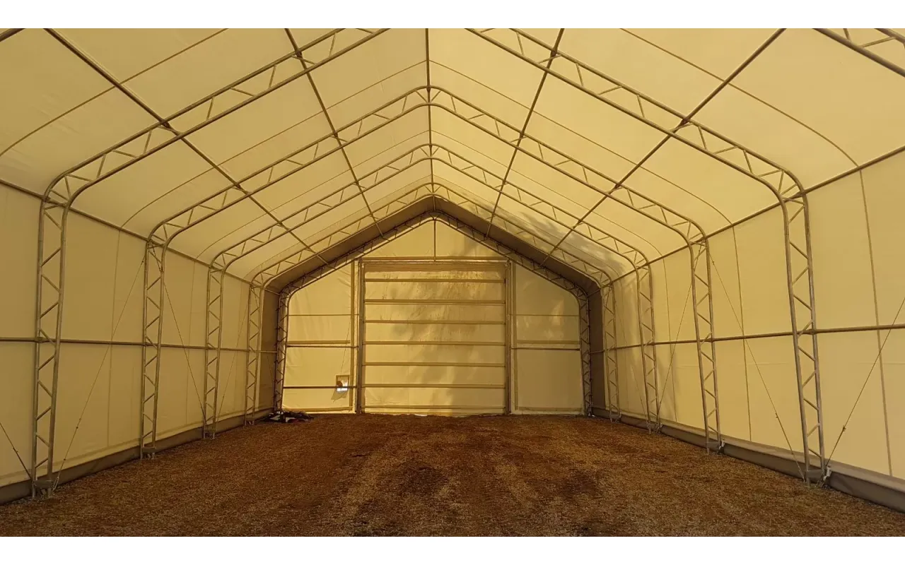 Die Ausführung mit Satteldach mit senkrechten, hohen Seitenwänden ermöglicht eine effektive Nutzung des Innenraums bis an die Seitenwände. Die Zelthalle mit Satteldach 9,15x12,2 m ist eine vielseitige Lösung für Industriebranche, Landwirtschaft und Lagerung. Die steile Dachkonstruktion aus PVC mit einer Grammatur von 900 g/m² unterstützt den korrekten Schneeabrutsch sowie den Wasserablauf und schützt vor Überlastung durch extreme Witterungsbedingungen. Als Lagerzelt bietet sie verlässliche, planbare Lagerfläche. Sprechen Sie uns für Details und Verfügbarkeit an.