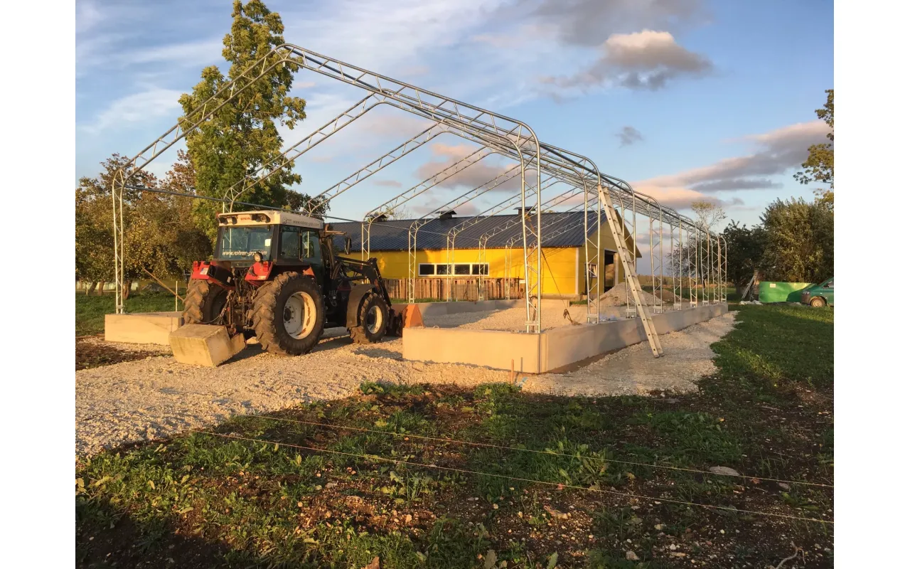 Die Konstruktion des Zeltes Zelthalle mit Satteldach 10x12,2 m PVC 900 g/m² zeichnet sich durch die Verwendung von Trägerrohren und Verbindern mit größerem Durchmesser aus, was zu einer erhöhten Festigkeit des gesamten Systems führt. Das Herzstück unserer Konstruktion ist Stahl, daher haben wir kaltgewalzten Baustahl verwendet. Zudem sind die Rahmenkomponenten perforiert und vermeiden Schweißnähte, da diese Technologie die höchste Widerstandsfähigkeit der Konstruktion gegen statische und dynamische Belastungen aufweist und potenzielle Verformungen verhindert. Zum Schutz des Rahmens (Zelthallen mit Satteldach) wurden die stählernen Komponenten einer galvanischen Verzinkung unterzogen. Diese Methode gewährleistet einen umfassenden Korrosionsschutz sowohl unter Innen- als auch Außenbedingungen. Dadurch zeigen die Stahlrohre eine hohe Widerstandsfähigkeit gegen Rostbildung. Das Spannsystem für Dach und Seitenwände besteht aus Stahldrähten. Dies sorgt für die Stabilität der Konstruktion, die sich nicht verformt und während der gesamten Nutzungsdauer fest bleibt. Dadurch wird auch die Plane vor Schnee- und Winddruck geschützt. Das interne Spannsystem ist bei Zelthalle mit Satteldach 10x12,2 m PVC 900 g/m² von entscheidender Bedeutung, da es das Material unter Spannung hält und das Entstehen von Falten und Wasseransammlungen auf der Planenoberfläche verhindert. Dies bietet eine bessere Schutzwirkung der Halle vor ungünstigen Wetterbedingungen wie starkem Wind oder Regen. Dieses System trägt auch zur Ästhetik des Zeltes bei und verleiht ihm ein makelloses und professionelles Aussehen.
