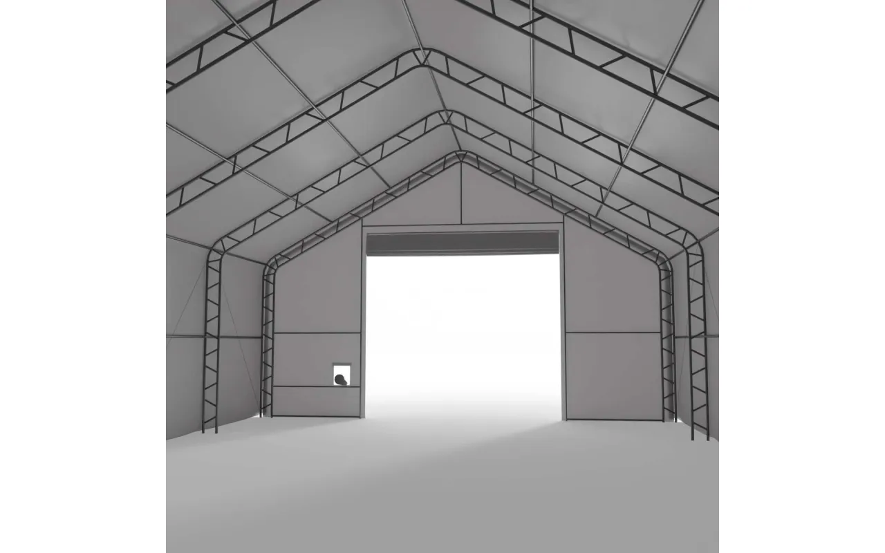 Die Wandkonstruktion der Zelthalle mit Satteldach mit senkrechten, hohen Seitenwänden ermöglicht eine effiziente Nutzung der Lagerfläche entlang der Seitenwände. Zelthalle mit Satteldach 18,3x45,75 m ist eine vielseitige Lösung für Industriebranche, Landwirtschaft und Lagerwirtschaft. Die steile Dachkonstruktion aus PVC mit einer Grammatur von 900 g/m² unterstützt den sicheren Schneeabrutsch und den Wasserablauf und schützt vor Überlastung durch extreme Witterungsbedingungen. Als Schnellmontage-Lösung lässt sich die Halle zügig realisieren und bei Bedarf umstellen. Ideal als Lagerzelt – lassen Sie sich vor der Bestellung beraten.